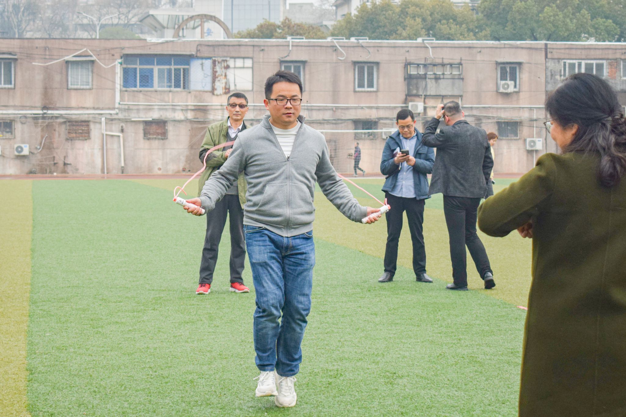 随着哨声响起,跳绳比赛开始了。纵身跃起,绳子稳稳地从身下甩过,只见老师们飞快地舞动手中的绳子,脚尖同地面不断触碰。比拼速度,收获友谊,操场上洋溢着老师们满满的喝彩声。