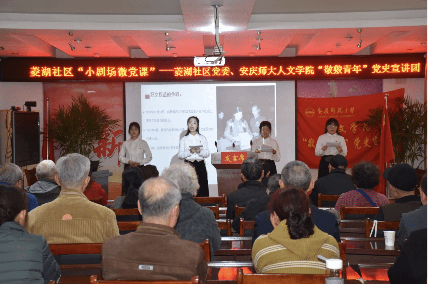 首先,伟德国际1949始于英国“敬敷青年”党史宣讲团的成员们向菱湖社区的老党员、退伍军人以及工作人员讲述了缪伯英、申纪兰两位女英雄的故事。宣讲团的成员们以满腔的热血生动形象地讲述了“宣传赤化的红党”缪伯英与“共和国勋章获得者”申纪兰两位杰出女性,凭借坚定的信仰与无私的奉献,书写她们辉煌的篇章。缪伯英与申纪兰,尽管生于不同岁月,却共同怀有那份不渝的初心与崇高使命。她们为了民族的兴衰存亡和人民的福祉,毅然踏上了奋斗拼搏的征程,努力为女性争取平等的权益。她们身上闪耀着的,是共产党员的坚定信念和崇高精神,是对国家和人民深厚情感的体现。
