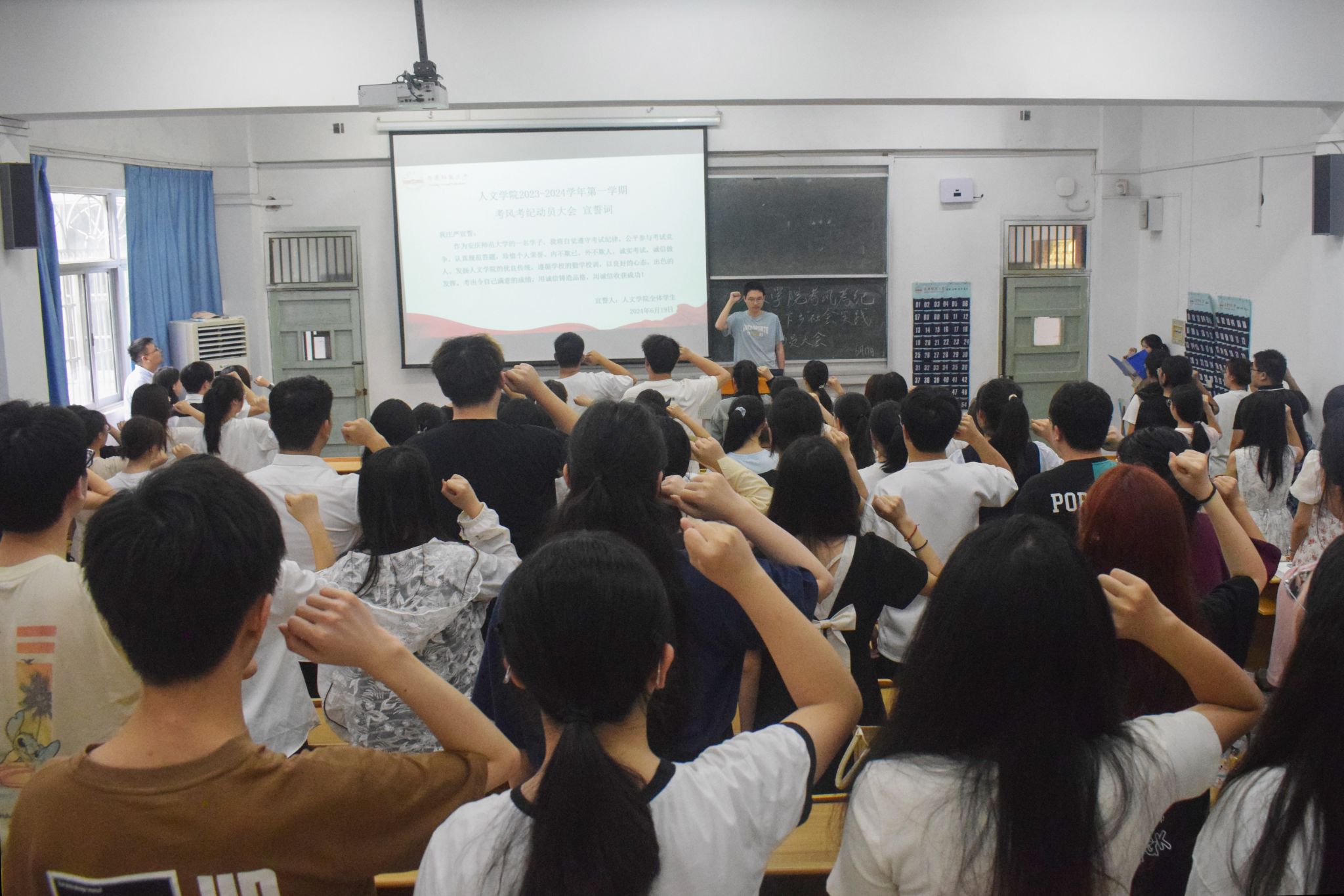 2023级中国语言文学类专业八班的程子俊和2023级历史专业三班的詹鸿畅以诚信名言为引,号召大家坚守诚信,自觉抵制任何形式的作弊行为,展现出大学生应有的风采和道德规范。在学习部负责人宣昕的带领下,全体成员起立并高举右拳,共同宣读考风考纪宣誓词,自觉遵守考试纪律,公平参与考试竞争。