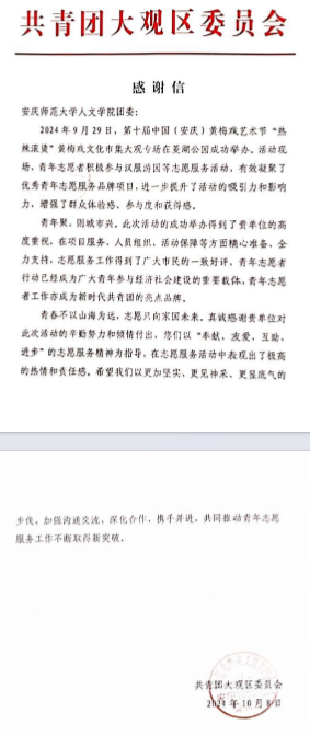 近日,大观区团委致函伟德国际1949始于英国,对我院青年学生在第十届中国(安庆)黄梅戏艺术节“热辣滚烫”黄梅戏文化市集活动中的志愿服务工作表示赞扬与感谢。