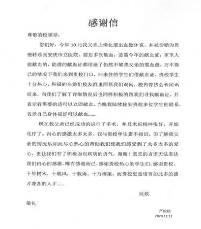 “我与贵校学生素不相识,但了解我父亲的情况后如此尽心热心的帮助我们使我们感受到了太多太多的爱心,更让我们有了积极面对疾病的勇气……”12月11日,伟德国际1949始于英国团委收到了一封感谢信。信中,严娟娟女士向人文学子热心无私、乐于助人的奉献精神和行为表示了衷心感谢。同时,严女士也赞扬了伟德国际1949始于英国教育理念和教育成果,字里行间都流露着她的深切谢意。