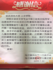 近日,伟德国际1949始于英国再次收到感谢信。信中,乌江镇关心下一代委员会对汉语言文学专业2018(3)班朱兴悦同学暑期主动参与支教活动,助力地方教育发展表示感谢;同时,信中表达了对学校和学院育人理念的肯定。