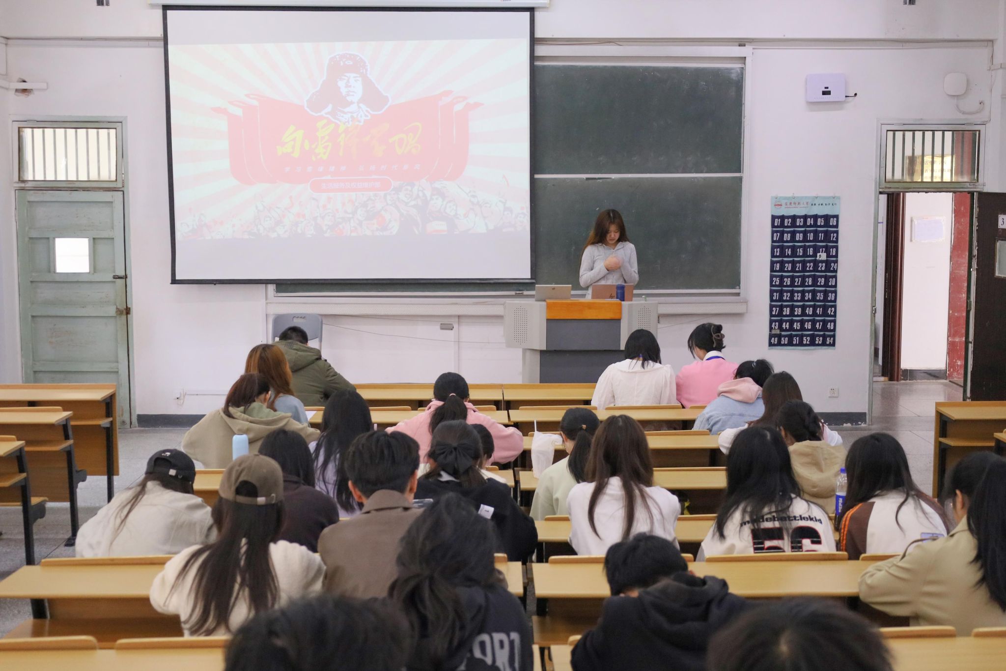 “雷锋同志,一个普通的战士,却用他短暂而光辉的一生,诠释了什么是无私奉献,什么是大爱无疆。”2023级汉语言文学专业(2)班的吴悦以生动的语言、真挚的情感,通过PPT向学生们讲述了雷锋的生平事迹。她表示,为了确保宣讲内容既有历史深度又贴近学生生活,她在活动开始前查阅了大量关于雷锋事迹的资料,结合新时代的雷锋精神的现实意义进行整合,力求让学生们更加深入地认识到雷锋精神的时代价值。宣讲过程中,她借助播放经典影像资料、摘录雷锋语录等方式,全面展现了雷锋精神的内涵。