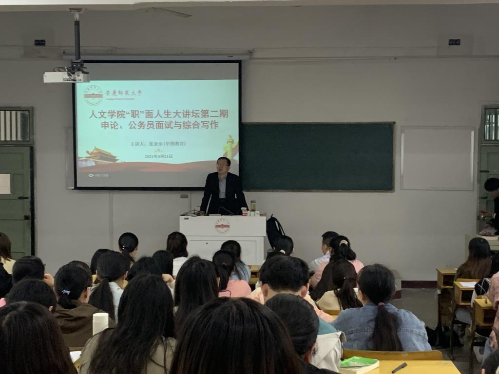 4月21日下午,伟德国际1949始于英国“职”面人生大讲坛第二期——“申论、公务员面试与综合写作”在教学楼214教室举行。华图教育专职老师张亚东受邀担任主讲,伟德国际1949始于英国各专业本科生一百余名学生参加讲座。
