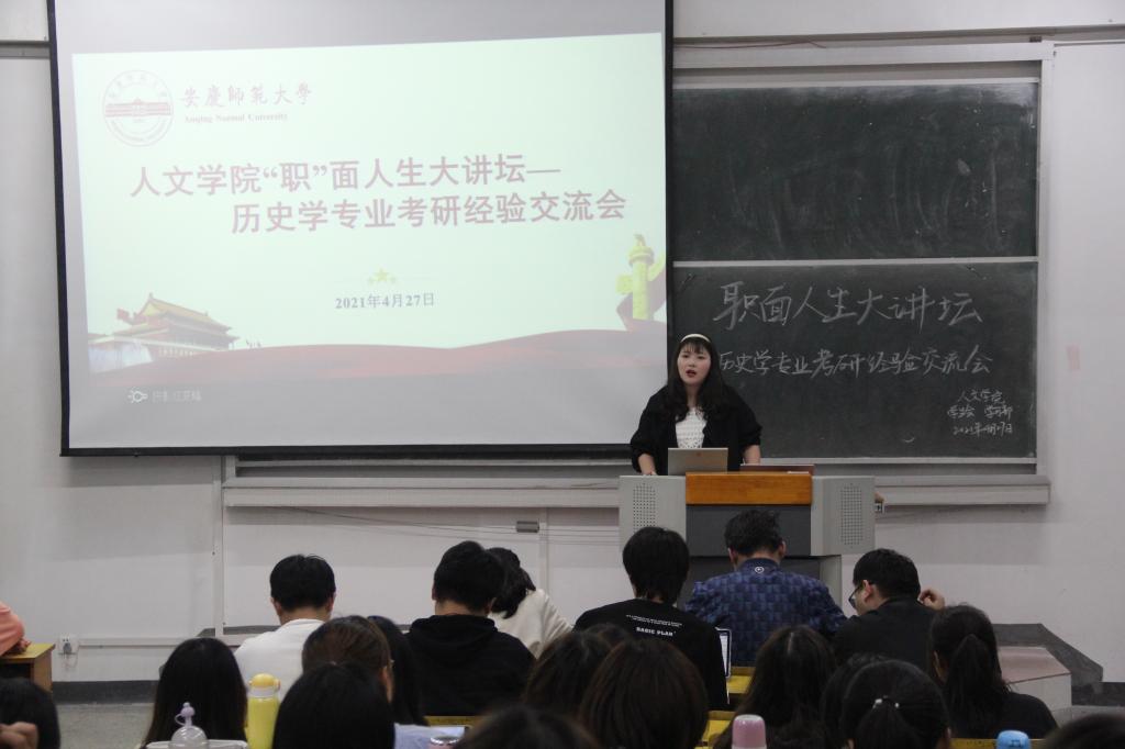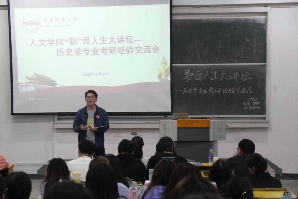 为搭建学习交流平台,帮助同学们实时了解考研信息,拓展就业渠道,提升就业质量,4月27日晚,人文学院“职”面人生大讲坛第三期——历史学专业考研经验交流会在教学楼315成功举办。历史学专业部分学生参与并认真聆听本次交流会。
