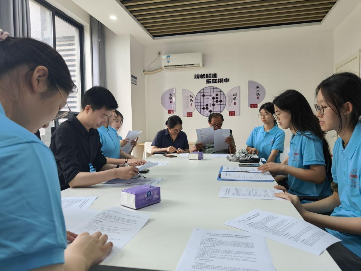 在实践活动对接会上,实践团师生与山口乡文化站站长朱燕,山口乡老年大学校长、《古皖风韵》主编王彰海共同研讨暑期“三下乡”推普实践活动方案。
