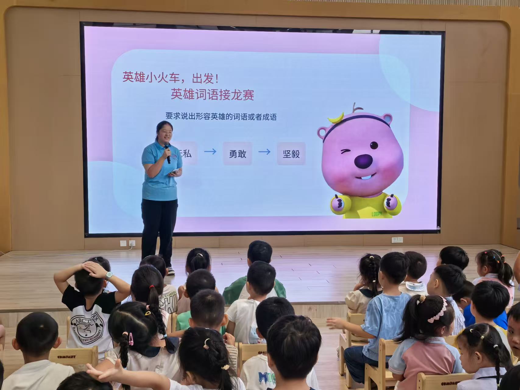 为了让孩子们更深入地理解和感受红色文化,志愿者同幼儿园老师一同组织“英雄词语接龙赛”推普实践活动。志愿者引导孩子们用普通话说出“勇敢”“无私”“坚强”等与英雄品质相关的词语,在游戏中积累词汇、强化认知。孩子们争相举手,用稚嫩但认真的普通话表达着自己对英雄的理解。有的孩子大声说:“英雄就是不怕困难!”还有的孩子说:“英雄会帮助别人!”志愿者对每个孩子的回答都给予了肯定和鼓励,让他们在游戏中感受到成功的喜悦,进一步增强了学习普通话和了解党史的兴趣。