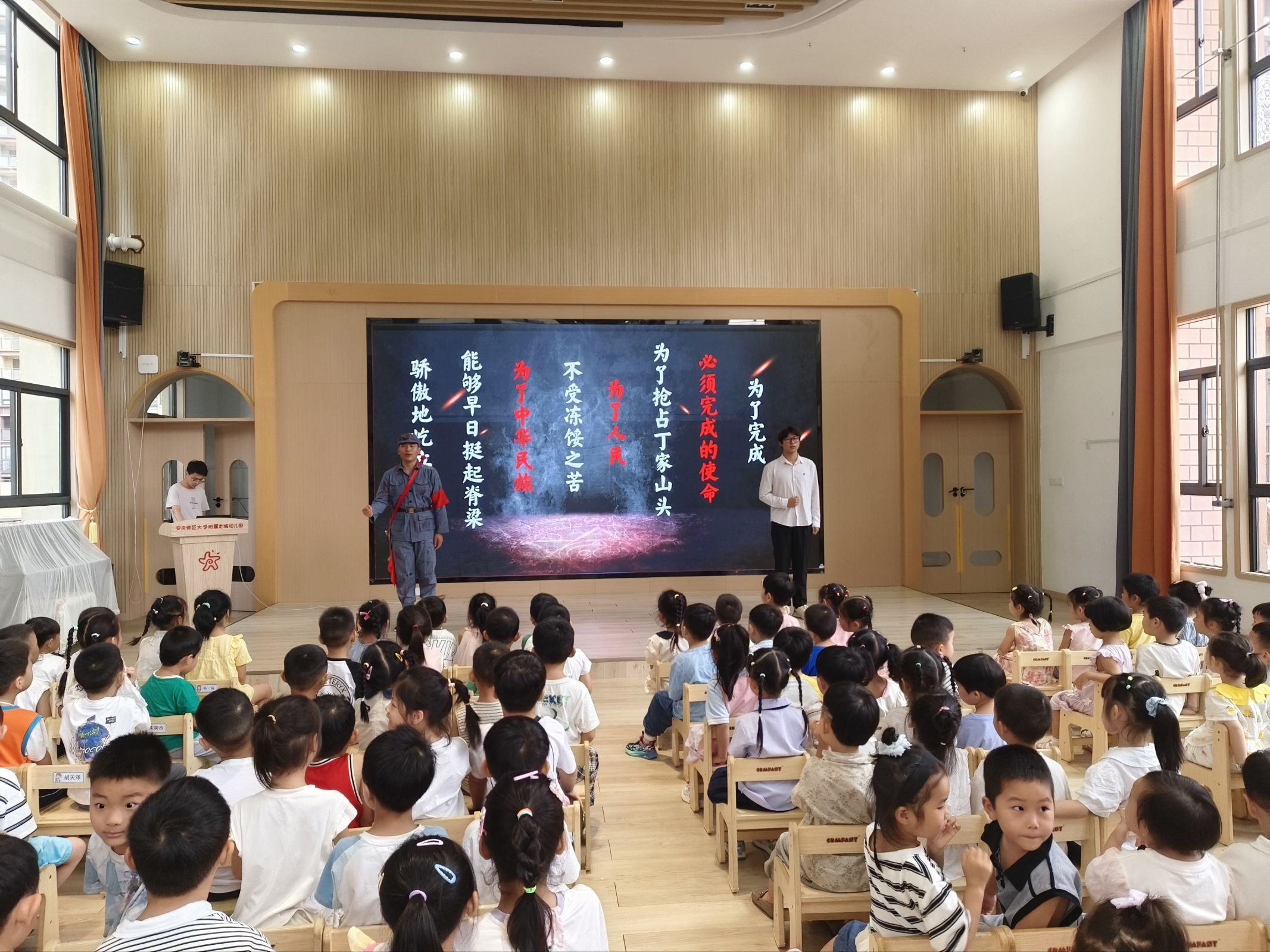 党史宣讲环节成为整场活动的核心亮点。“敬敷青年”党史宣讲团团长程子俊与成员陈德昌,以安庆籍抗战烈士程雄的生平事迹为核心,带来沉浸式微宣讲《必须完成的使命》。伴随着缓缓流淌的深情背景音乐,大屏幕同步展示程雄烈士的历史照片,宣讲者以第一人称代入角色,声情并茂地还原了程雄的人生轨迹:从立志参军、告别家人投身革命,到在战场上写下“儿以身许国,再难尽孝”的绝笔家书,既讲述他“舍生取义、不负家国”的坚定抉择,也传递了他对父母的温情牵挂。烈士的革命意志与家国情怀通过生动的讲述变得可感可知,孩子们全程凝神静听,小脸上满是专注,有的孩子悄悄攥紧小手,有的眼睛里泛起微光。这种艺术化的宣讲方式,摒弃了复杂理论的说教,让“英雄”“爱国”等抽象概念通过幼儿能理解的语言与情感,真正走进他们的心里。