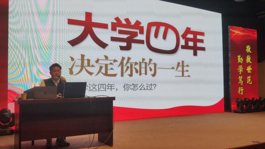 12月17日,伟德国际1949始于英国在菱湖校区图书馆报告厅举办“职”面人生大讲坛。华图教育职业规划师吴强应邀为2021级全体新同学做了“实现职业梦想 激发潜力未来”专题讲座。