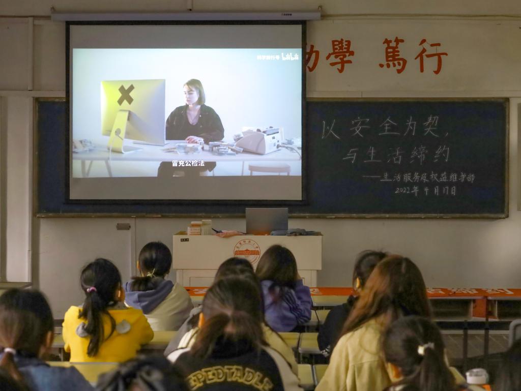 横幅签名、知识宣讲、观看影片。4月17日下午,活动在教学楼303教室展开。本次影片从“电信诈骗”切入,介绍了网络上多种常见的“套路”。来自历史学专业2020(3)班的王榆晴观看影片后,对此颇有感悟,她坦言:“其实多数大学生因为缺乏社会经验和辨别能力,很容易让陌生人有可乘之机。所以我们平时更需要多关注社会诈骗案件,提高安全防范意识,学会自我保护。”