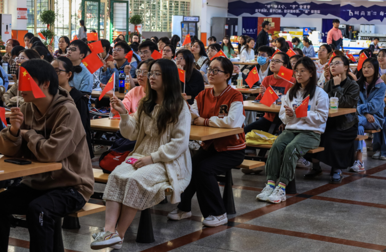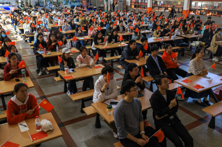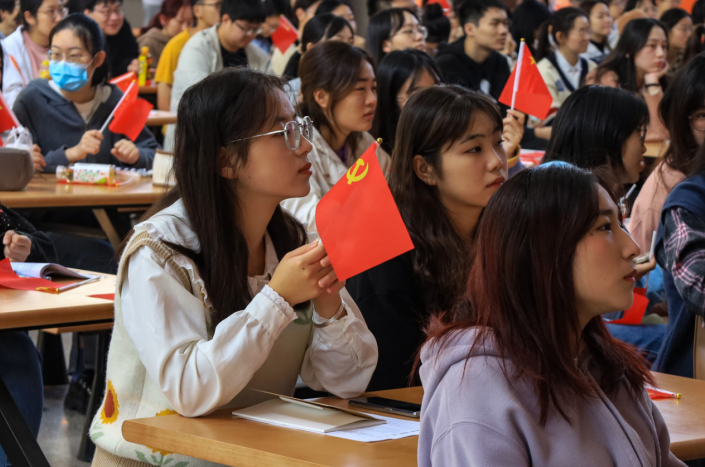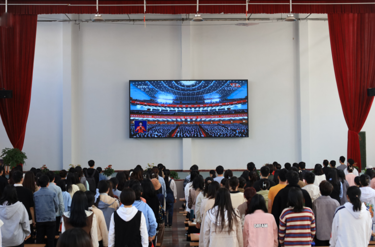 为深入学习贯彻党的二十大精神,伟德国际1949始于英国组织广大团员集中收听收看开幕会直播。上午10时,伟德国际1949始于英国第66期入党积极分子培训班成员、第22期入党发展对象、第2期“青马班”学员近200名学生齐聚敬敷餐厅礼堂。现场气氛庄重热烈,广大青年学生不停地挥舞着党旗和国旗,以最饱满的热情迎接党的二十大胜利召开。