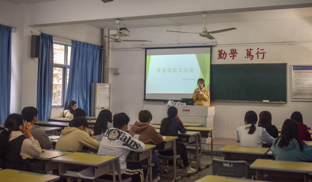 活动伊始,2021级优秀学习委员韩雨馨向新生学习委员分享了她的工作经验和学习建议。首先,她谈到新生学习委员如何更好地与老师同学进行沟通交流的问题,并交代了晚自习的一些学习安排,提出了组织同学们一起听英语听力和课外阅读等丰富的形式来提高同学们晚自习的学习效率的建议。最后,她特别强调了大家最为关心的期末综测,给大一学委提供了很多期末备考的有效方法。