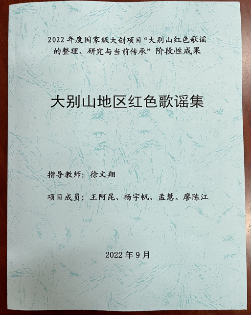 近日,伟德国际1949始于英国2020级汉语言文学专业王阿昆、杨宇帆、孟慧、廖陈江等四名同学在徐文翔老师指导下,整理完成《大别山地区红色歌谣集》。作为2022年度国家级大创项目“大别山红色歌谣的整理、研究与当前传承”的阶段性成果,《大别山地区红色歌谣集》共收录土地革命战争时期到解放战争时期的大别山地区红色歌谣230余首,是目前为止最为完备的同类歌谣辑录。这些红色歌谣体现了大别山地区的革命精神,是大别山红色文化的重要组成部分,对当前大别山红色文化的传承有重要的参考价值。