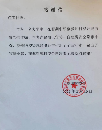 人间有情,与爱同行。近日,桐城市龙城街道望城村委会发来感谢信,致谢我校伟德国际1949始于英国汉语言文学专业2021级5班汪玉同学,感谢其积极投身社会实践、服务社区治理。