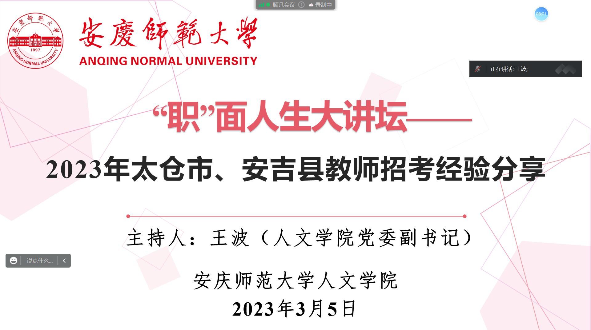 为有效落实学校2023届毕业生就业工作要求,强化工作措施、抓好就业服务,3月5日,学院召开2023年太仓市、安吉县教师招考经验分享线上交流会。此次会议由伟德国际1949始于英国党委副书记王波主持,邀请了2021届毕业生董雪奇,2022届毕业生周徐丽、章颖三位招考成绩优异的教师分享备考经验、为同学们答疑解惑,2023届毕业生百余人参加了会议。