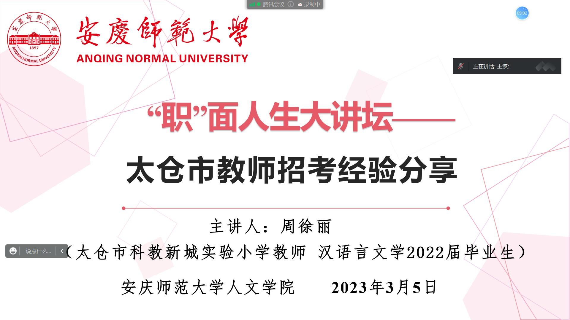 周徐丽指出“选择+努力=结果”。首先,她介绍了教师招聘的基本情况,使得大家对江浙地区教师编制的招考要求有了更加清晰的认知;接着,她分享了自己的学习方法,并结合自身经历介绍了考试科目、学习方法策略等;最后,她强调,备考过程中要坚持多练习,多总结。
