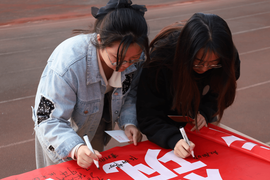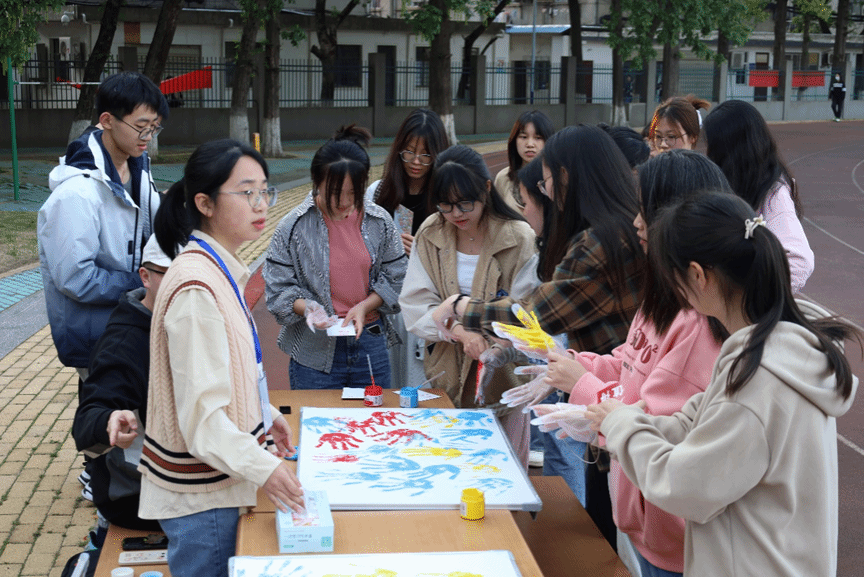 活动围绕操场跑道共设置了“理想”“信念”“青春”“未来”四个站点。参与活动的同学按照顺序依次到4个站点完成相应的任务后,分别可以获得“觉醒”“建设”“开放”“崛起”四个专属印章,最后可凭借打卡盖章记录到操场中央参与抽奖活动并领取一份纪念品。活动现场一片欢声笑语,同学们写寄语、签姓名、盖手印、与共青团主题玩偶团团合照打卡,留下最美的青春模样。