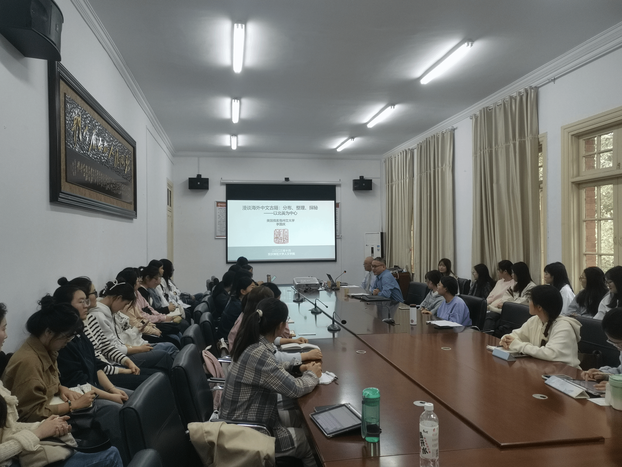李国庆教授首先简要介绍了北美地区中文古籍文献收藏概况。随后,他结合自身的工作经历介绍了《海外中文古籍总目》编纂项目的重要价值和实施进度。最后,他详细介绍了耶鲁大学、伊利诺亚大学、俄亥俄州立大学、夏威夷大学等北美高校的中文古籍馆藏现状,以及这些藏书背后的历史故事。讲座结束后,李国庆教授还就相关问题同与会师生进行了深入交流。