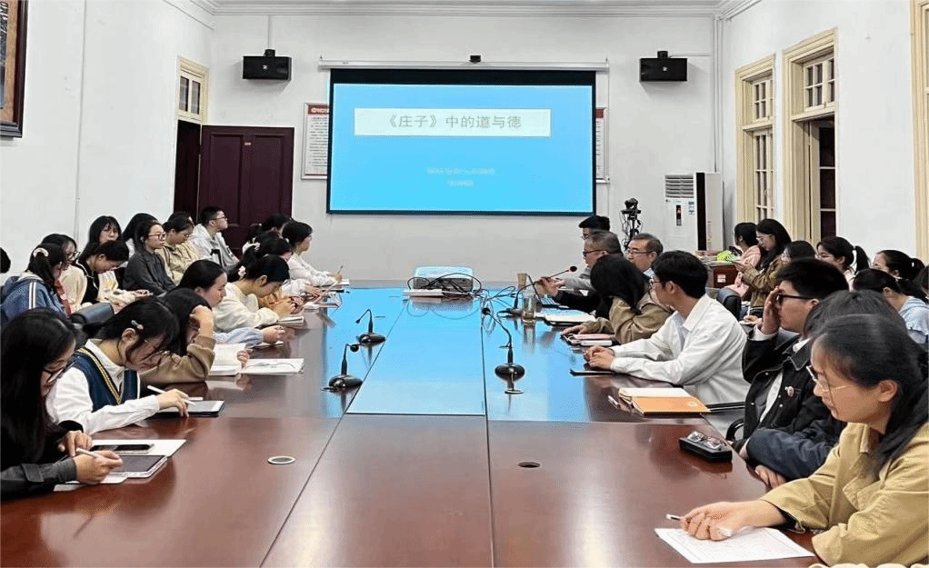 孙明君教授结合《庄子》文本,从“逍遥”和“齐物”两个方面阐述了庄子的道论,以安命思想为中心探讨了庄子的德论;然后就庄子的天人观、养生观、处世观、生死观、政治观,谈论庄子道论和德论思想在不同方面的投射。讲座结束后,孙教授和与会师生进行了深入的交流。
