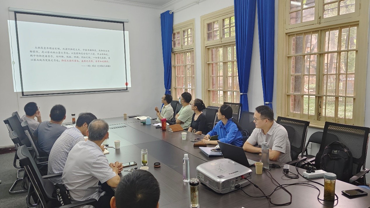 会议伊始,王顺博士作了题为《明代监察制度的概况与研究进展》的学术报告。报告系统阐述了明代监察制度的总体面貌与研究动态。明代监察制度体系严密,以都察院、六科给事中和提刑按察司为核心,构成了中央与地方分层运作的监察网络。都察院作为最高监察机关,职掌纠劾百司、考察官员、审理重狱及提督各道;六科负责稽核奏章、监督政务执行,以防壅蔽;提刑按察司则作为“外台”,主导一省刑名与监察事务。报告还梳理了20世纪以来学界对明代监察制度的研究历程,从整体梳理到专题深入,体现了多学科、区域化研究的趋势。