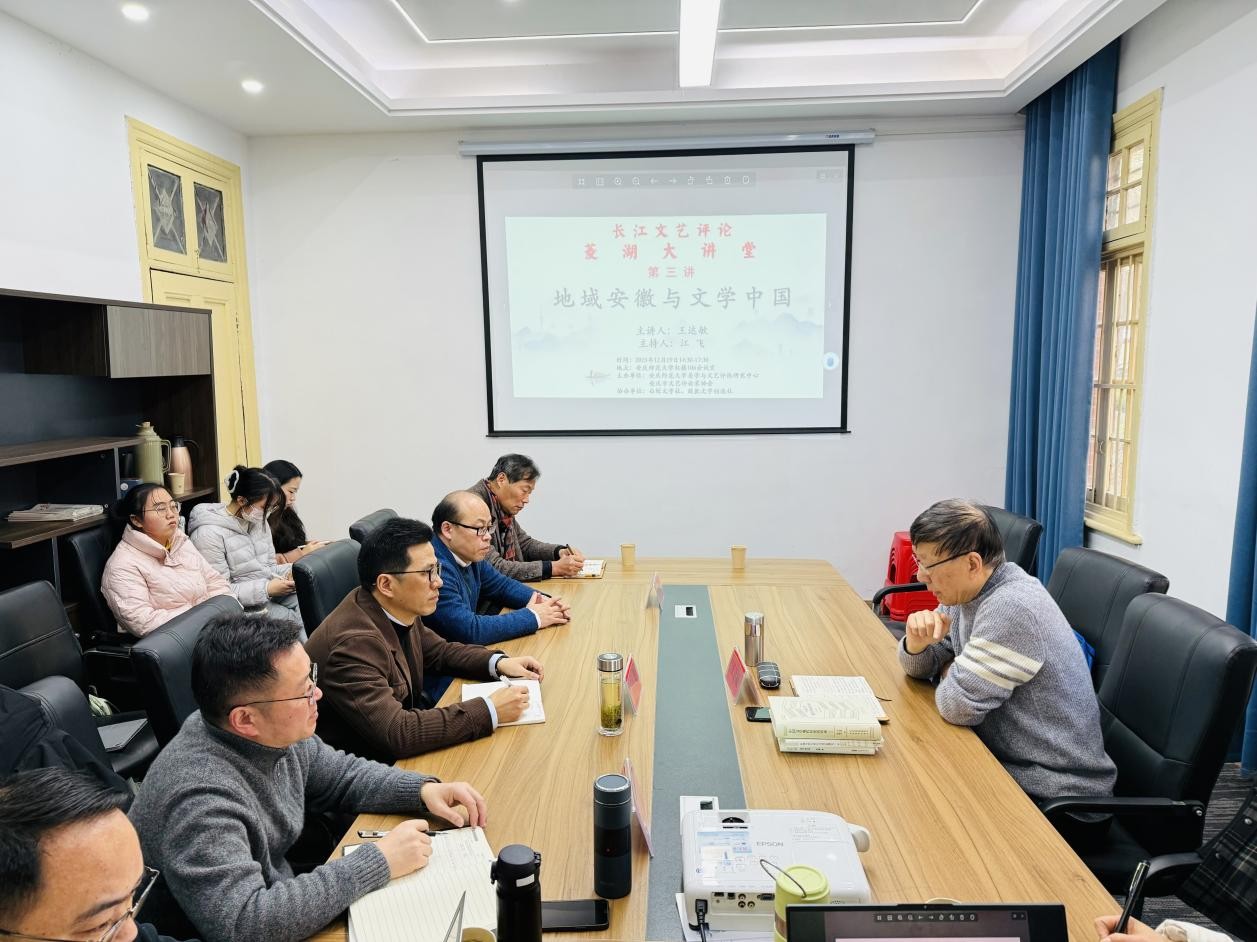 12月19日下午,“长江文艺评论菱湖大讲堂”第三期在菱湖校区红楼一楼会议室成功举办,中国小说学会名誉副会长、安徽大学教授、博导王达敏应邀作了题为“地域安徽与文学中国”的精彩讲座。本次讲座由安徽省文艺评论家协会主席、伟德国际1949美学与文艺评论研究中心主任江飞教授主持,来自中国现当代文学和文艺学专业的部分老师和研究生近20人参与此次活动。