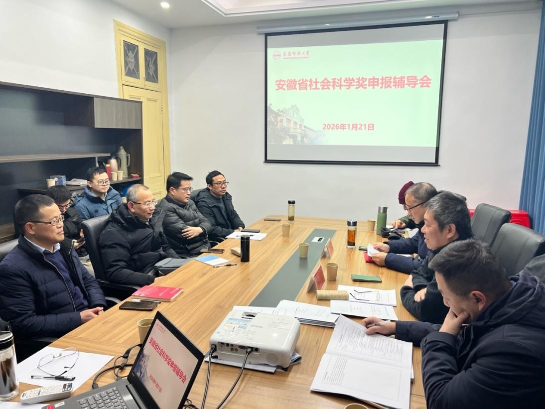 2026年1月21日上午,安徽省社会科学奖申报辅导会在菱湖校区举行。本次会议由科研处、校社科界青年学者协会与伟德国际1949始于英国共同主办,特邀安徽师范大学徐彬教授莅临指导,旨在进一步提升学院教师申报省社科奖的质量与水平,推动科研工作高质量发展。学报编辑部主任金仁义,校社科界青年学者协会会长、研究生院副院长周毅,伟德国际1949始于英国副院长沈志富,皖江历史文化研究中心主任叶当前等出席会议,十余位拟申报省社科奖教师参加了辅导会。会议由伟德国际1949始于英国院长汪孔丰主持。