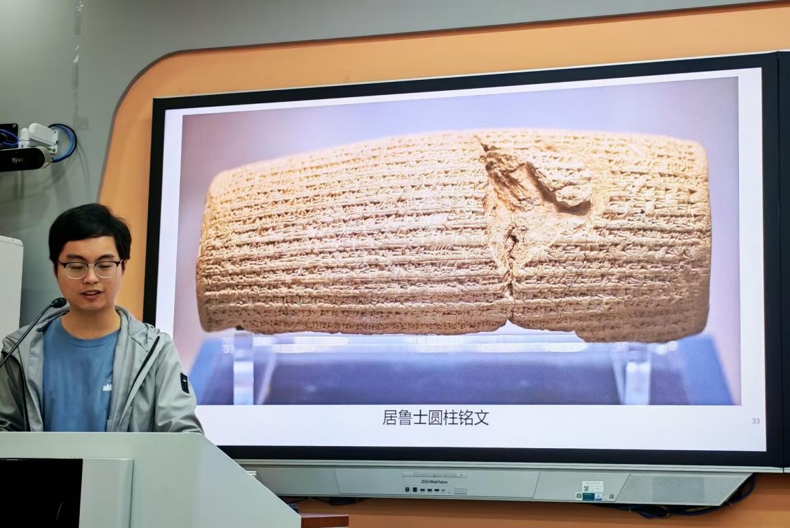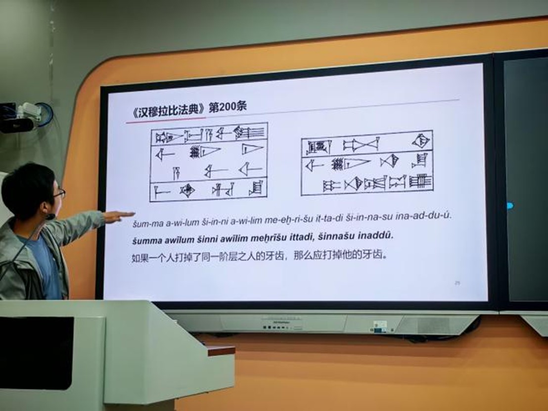 在讲授过程中,詹博士围绕楔形文字的基本状况、书写载体、文献类型、破译过程及其起源演变等内容展开系统讲解。他指出,楔形文字使用时间长、传播范围广,是研究古代近东历史不可或缺的重要史料基础。围绕楔形文字文献的类型与价值,詹博士列举了《吉尔伽美什》《汉谟拉比法典》等重要文献,并结合占卜文献等实例,分析了不同类型文献在楔形文字学习与古代文明研究中的独特意义。