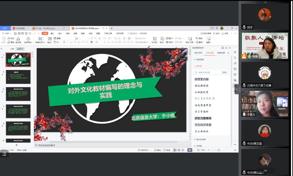 12月1日下午14时,敬敷人文讲坛第二十六讲顺利举行,北京语言大学文学院教授、博士生导师于小植应伟德国际1949始于英国邀请作了题为“文化教材编写的理念与实践”的线上讲座。本次讲座由张瑾博士主持,李金梅副教授与谈,该院部分青年教师、研究生和汉语国际教育专业本科生共50余人参与线上交流学习。