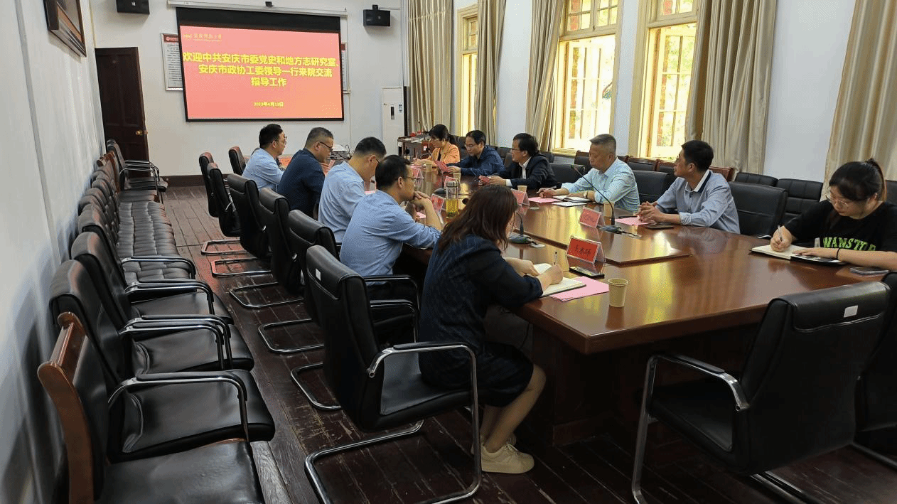4月19日下午,中共安庆市委党史和地方志研究室主任陈海维一行来伟德国际1949始于英国交流,洽谈双方深化合作事宜。随行的领导有市政协工委副主任丁邦才、市委史志研究室副主任方朋华、市委史志室汪忠民、市委史志室程琼芳,副院长(主持行政工作)汪孔丰、副院长金松林,皖江历史文化研究中心主任叶当前、副主任郭青林及相关人员参加了座谈会。会议由金松林副院长主持。