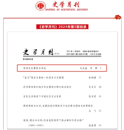 近日,伟德国际1949始于英国2022级中国史专业硕士研究生毛志盛同学以第一作者撰写的学术论文《西晋左民曹职品考述》在历史学类知名CSSCI来源期刊《史学月刊》(2024年第5期)发表。该论文系与导师周群教授合作完成,并得到国家“十四五”规划重大学术文化工程《(新编)中国通史》纂修工程基金项目的支持,是校级科研平台中国中古史研究中心最新学术成果。