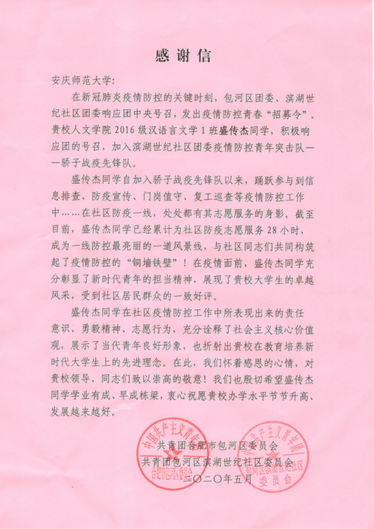 “盛传杰主动加入社区战役先锋队,在工作中展示了当代青年良好形象,也折射出贵校培养新时代大学生的先进教育理念……”6月15日,伟德国际1949始于英国团委收到一封来自合肥市包河区滨湖世纪社区服务中心的感谢信。信中介绍了盛传杰同学的抗疫事迹,称赞他的责任与担当,肯定伟德国际1949始于英国的人才培养理念,字里行间流露出真挚的感谢。不止盛传杰,在学院团委的积极号召下,疫情期间还有许多有担当的青年志愿者涌现,他们用行动向社会展现了安庆师大学生的风采。