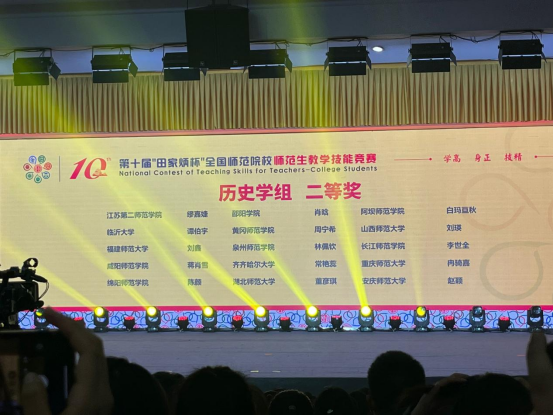 2024年11月29日至12月1日,由全国地方高等师范院校教务处长联席会议指导、“田家炳”基金会冠名,浙江师范大学主办的2024年第十届“田家炳杯”全国师范院校师范生教学技能竞赛决赛在浙江金华举行,我院2021级历史学(师范)赵颖同学参加本次决赛并获得二等奖。
