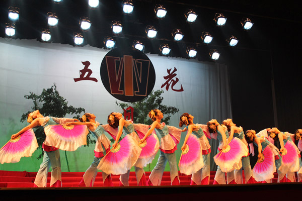 富有民族特色的新疆舞蹈是今年“五月花”晚会的一道亮丽风景,这是由13名新疆班学员表演的。她们身着鲜艳的民族服装,头顶瓷碗,手持盘碟,中指上佩戴的顶针敲打着碟子,发出悦耳的哒哒声。来自边疆的风情让观众们眼前一亮,场上掌声雷动。