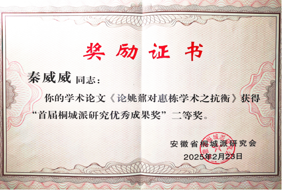 2025年2月23日,安徽省桐城派研究会三届三次理事会议暨首届桐城派研究优秀成果奖颁奖仪式,于桐城圆满举行。伟德国际1949始于英国新近入职的青年教师秦威威博士,其发表于《安徽大学学报(哲学社会科学版)》的论文《论姚鼐对惠栋学术之抗衡》,荣获桐城派研究优秀成果奖二等奖。安徽省桐城派研究会顾问、南京大学文学院许结教授,亲自为秦威威博士颁发了荣誉证书。