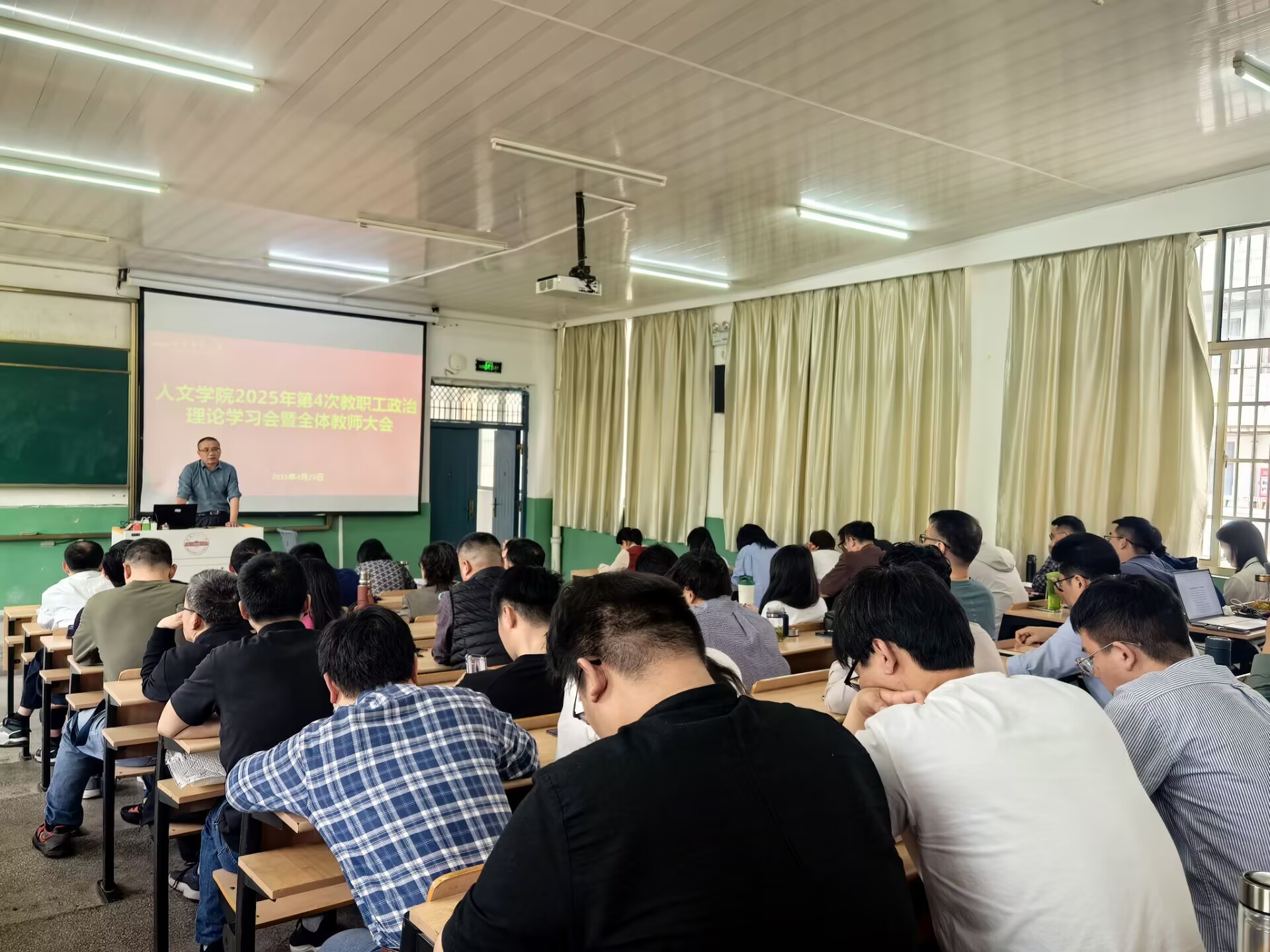 4月23日,伟德国际1949始于英国在理二阶教室召开2025年第4次教职工政治理论学习会暨全体教师大会。汪孔丰院长主持会议,全体教职工参加会议。