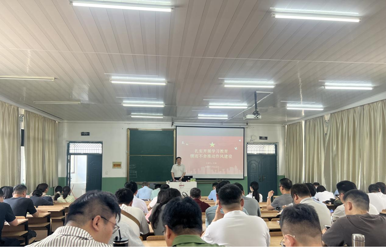 会上,党委书记王波做了题为《扎实开展学习教育 锲而不舍推动作风建设》专题党课。王波从土地革命、解放战争、社会主义建设和改革开放四个时期,回顾了党的百年奋斗征程中作风建设历程,重点围绕怎么看和怎么干几个维度,推动学院作风建设走深走实。王波强调,中央八项规定聚焦解决党内作风问题,是新时代全面从严管党治党的切入口和动员令,明确了新形势下作风建设的方向和方法。对于全体教职工他提出三点要求:一是加强理论武装,深化对中央八项规定精神的领会;二是发挥党员教师的“头雁”作用,带头遵规守纪,抵制不良作风;三是坚持奋发有为中干,将作风建设实效转化为推动学院发展的实际。