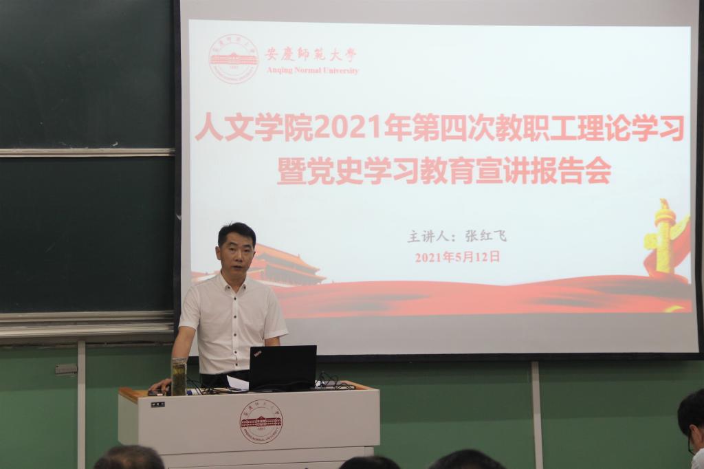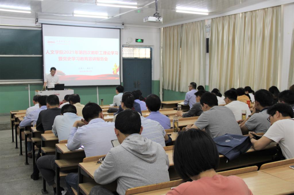 5月12日,伟德国际1949始于英国在菱湖校区化学楼理二阶教室举办2021年第4次教职工政治理论学习暨党史学习教育宣讲报告会。人文学院党委书记、校党史学习教育宣讲团成员张红飞作专题报告,领导班子成员和全体教职工参加会议。