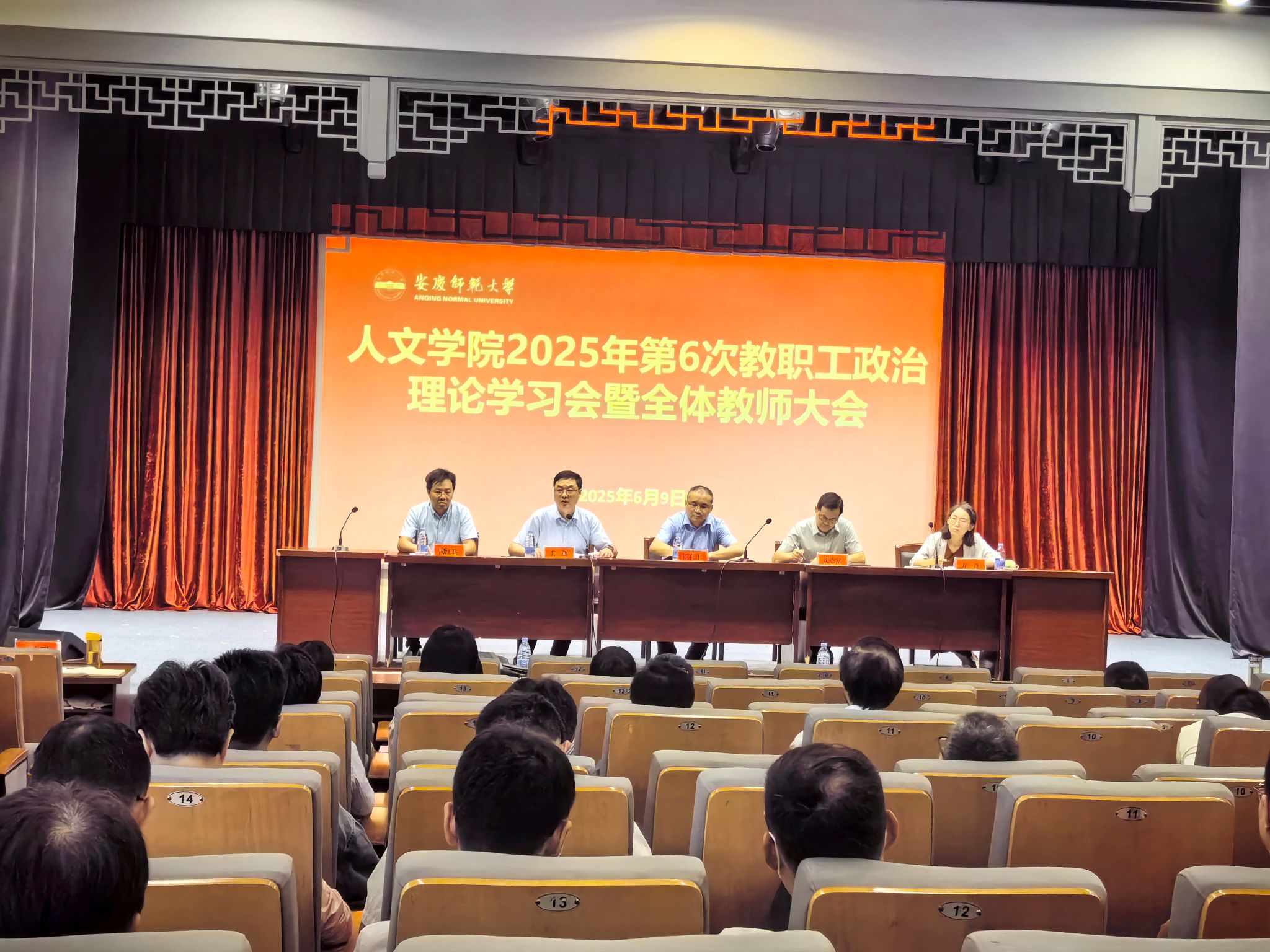 6月9日,伟德国际1949始于英国在菱湖校区图书馆报告厅召开2025年第6次教职工政治理论学习会暨全体教师大会。会议由院长汪孔丰主持,全体教职工参加会议。