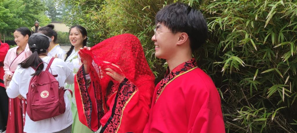 在孔雀东南飞文化园内,人文学子还参加了“剧场再现”活动,与文化园工作人员一同演绎了焦刘二人新婚的场景。一场跨越千年的情境体验,让人文学子更真实地认识了古代人民的生活风俗,对理解古代文学中的一些表达大有脾益。