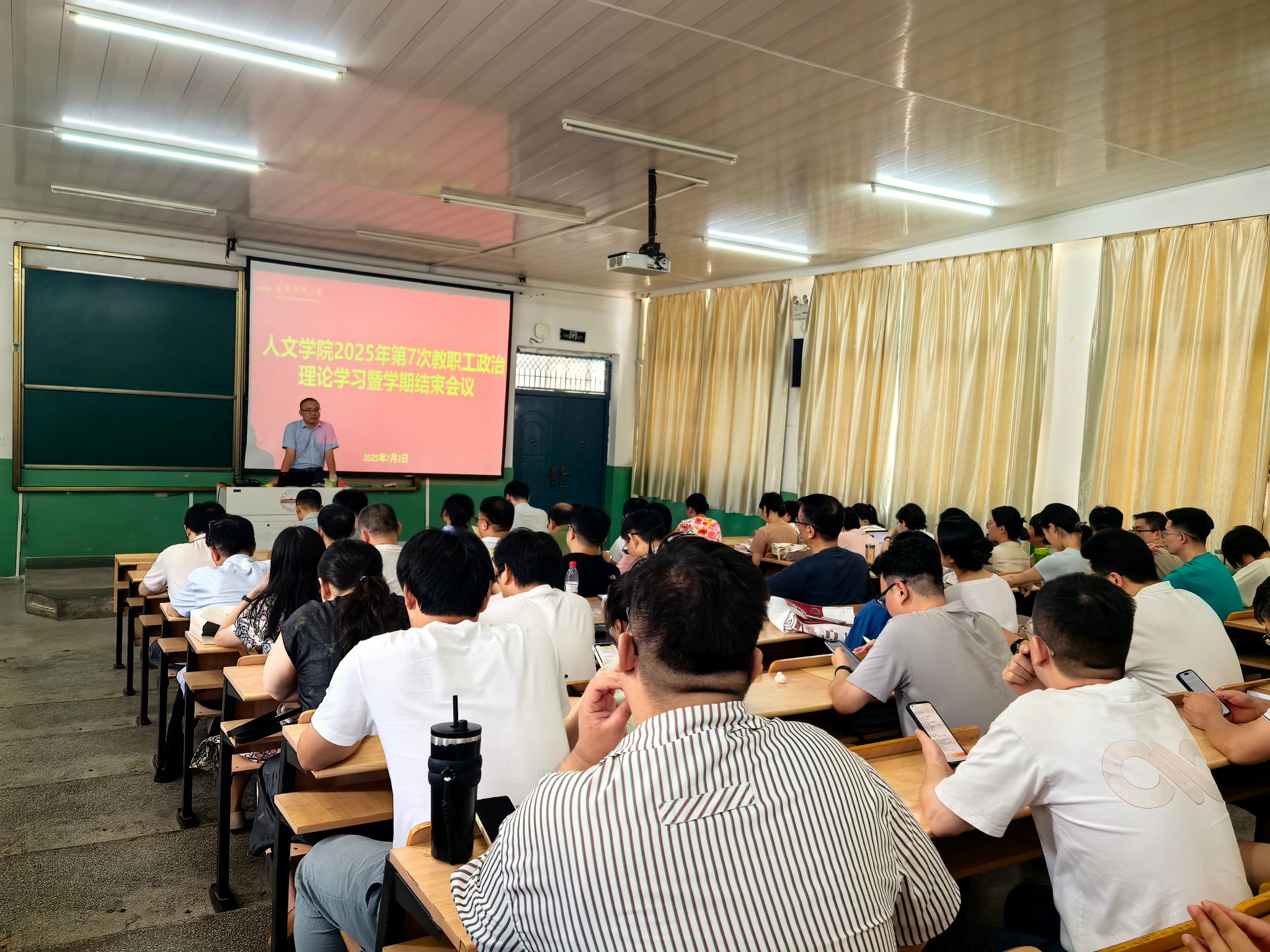7月2日,伟德国际1949始于英国在菱湖校区理二阶教室召开2025年第7次教职工政治理论学习会暨学期结束会议。会议由院长汪孔丰主持,全体教职工参加会议。