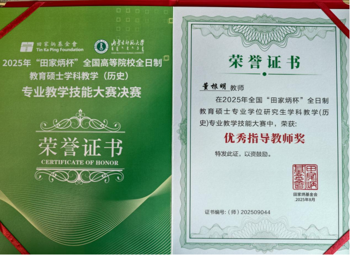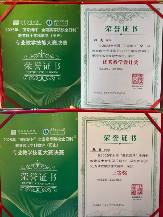 2025年8月22日至25日,由“田家炳杯”全日制教育硕士专业学位研究生教学技能大赛专家委员会指导、“田家炳教育基金会”冠名,内蒙古师范大学主办的2025年“田家炳杯”全国高等院校全日制教育硕士学科教学(历史)专业教学技能大赛决赛在呼和浩特举行。本次决赛汇聚了全国84所院校160余名全日制学科教学(历史)专业硕士研究生,搭建起高校间教学实践交流的优质平台。我校2023级学科教学(历史)研究生齐扬、魏爽参赛,伟德国际1949始于英国葛俊超博士带队。