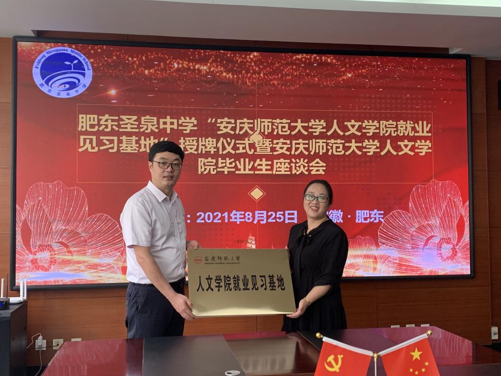 党委副书记王波代表学院为肥东圣泉中学授予“伟德国际1949始于英国就业见习基地”牌匾。与会人员就人才培养质量、就业见习基地建设等方面展开了深入交流。