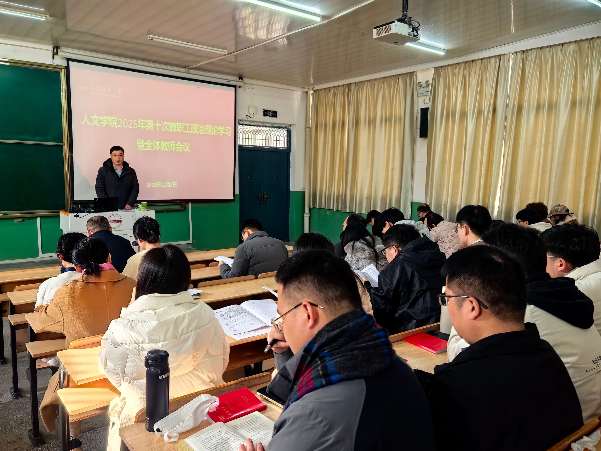 学院党委书记王波向全体教职工开展了党的二十届四中全会精神宣讲,宣讲聚焦繁荣发展社会主义文化。会议要求,全体教师要立足文化强国战略部署,深挖安徽长江文化、黄梅戏文化等地域特色资源,推动文化传承与学术研究、人才培养深度融合,以学科优势赋能地方文化事业与产业协同发展,为中国式现代化安徽篇章注入人文力量。