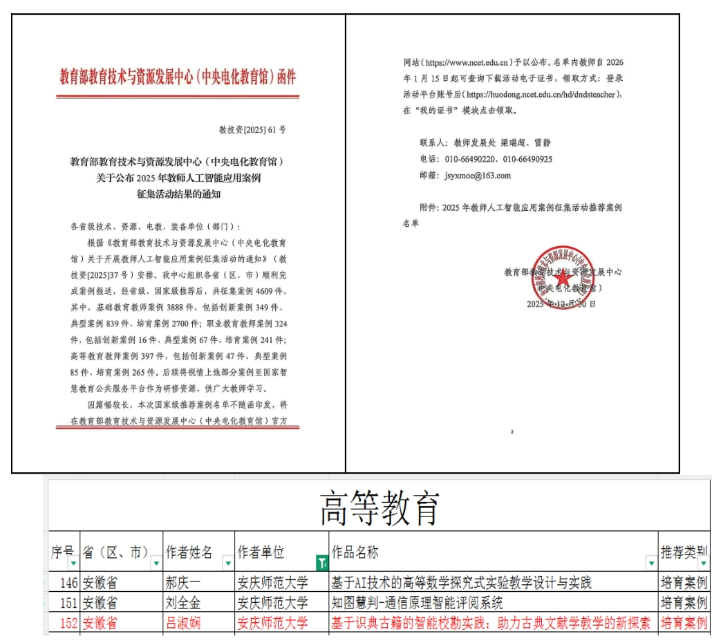 近日,教育部教育技术与资源发展中心(中央电化教育馆)公布“2025年教师人工智能应用案例征集活动”评审结果,我院数字人文专业教研室教师吕淑娴报送的案例《基于识典古籍的智能校勘实践:助力古典文献学教学的新探索》成功入选“培育案例”,这是学院首次获得该项案例。