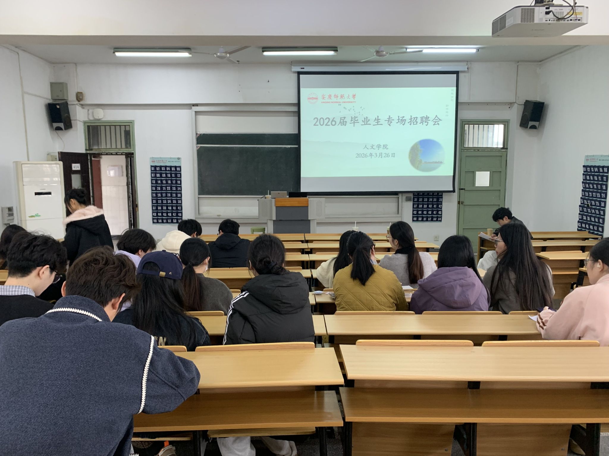3月26日,伟德国际1949始于英国在菱湖校区教学楼414教室举办2026届毕业生专场招聘会,邀请芜湖市止境科技有限公司来校宣讲招聘。学院党委副书记方蓬、毕业班辅导员及2026届汉语言文学专业毕业生参加活动。