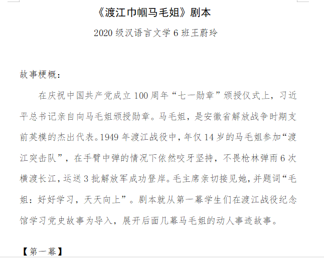 为增强学生的爱国意识、爱党意识、爱团意识,伟德国际1949始于英国话剧社征集与“红色记忆”小品、相声、话剧等相关语言艺术作品。话剧社社长、汉语言文学专业2019级1班万昕表示,选择“探寻家乡红色记忆”作为活动主题目的是让大家了解家乡的革命历史,体会那段艰难岁月。中国语言文学类2021级7班曹忆凡参加了本次比赛,在谈及剧本创作时,她说:“在创作之前我了解到2022年是建团一百周年,我对当时在安庆成立安徽共青团的主要历史人物做了调研。通过这次有意义的寒假活动,我了解了那段风云动荡的年代,我也要像先辈们学习,开拓进取、不懈奋斗!”