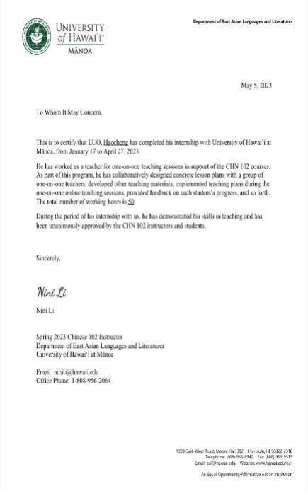 近日,伟德国际1949始于英国组织并参与实施的“2023年春季美国夏威夷大学东亚语言文学系在线中文单班课”实践项目第一期圆满完成。本次线上国际中文教学实践为期十四周,伟德国际1949始于英国24名师生顺利完成授课任务并获得夏威夷大学的实习证明。