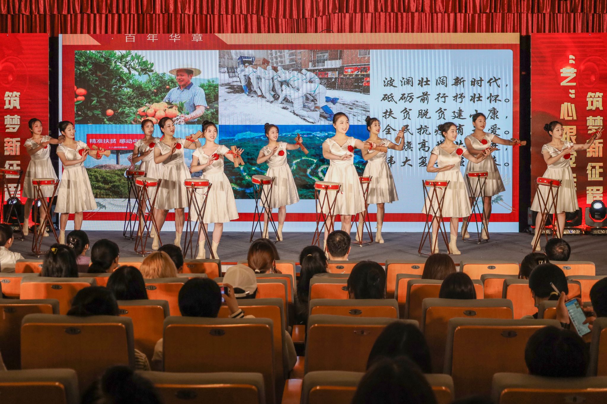 百年奋斗,百年追梦,百年恰是风华正茂。黄梅剧艺术学院11名学子胸口配花,身着统一服饰,带来黄梅大鼓表演《百年华章》。节目融入传统的黄梅调音乐唱腔元素,学生们在舞台上唱大鼓、打竹板,温婉中不失气势,豪迈中柔情尚存。婉转的戏腔,自然的神情,铿锵有力的击鼓,学生们通过不同的唱词和舞台走位,生动演绎了党在不同历史阶段的发展历程。