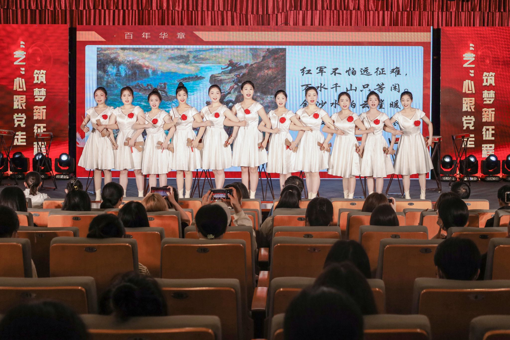 “共产党的恩情,比那东海还深。”“唤醒百花齐开放,高歌欢庆新春来,新春来……”黄梅戏表演专业2021(1)班的吴银梅一袭红衫,缓步上台,带来歌曲《洪湖水浪打浪》和《红梅赞》。两首红色歌曲节奏舒缓,将党的恩情娓娓道来,展现出浓厚的革命精神,打动了在场全体师生。“我很荣幸,能用自己的专业所学来表达对党的赞美和钦佩之情。”吴银梅表示。
