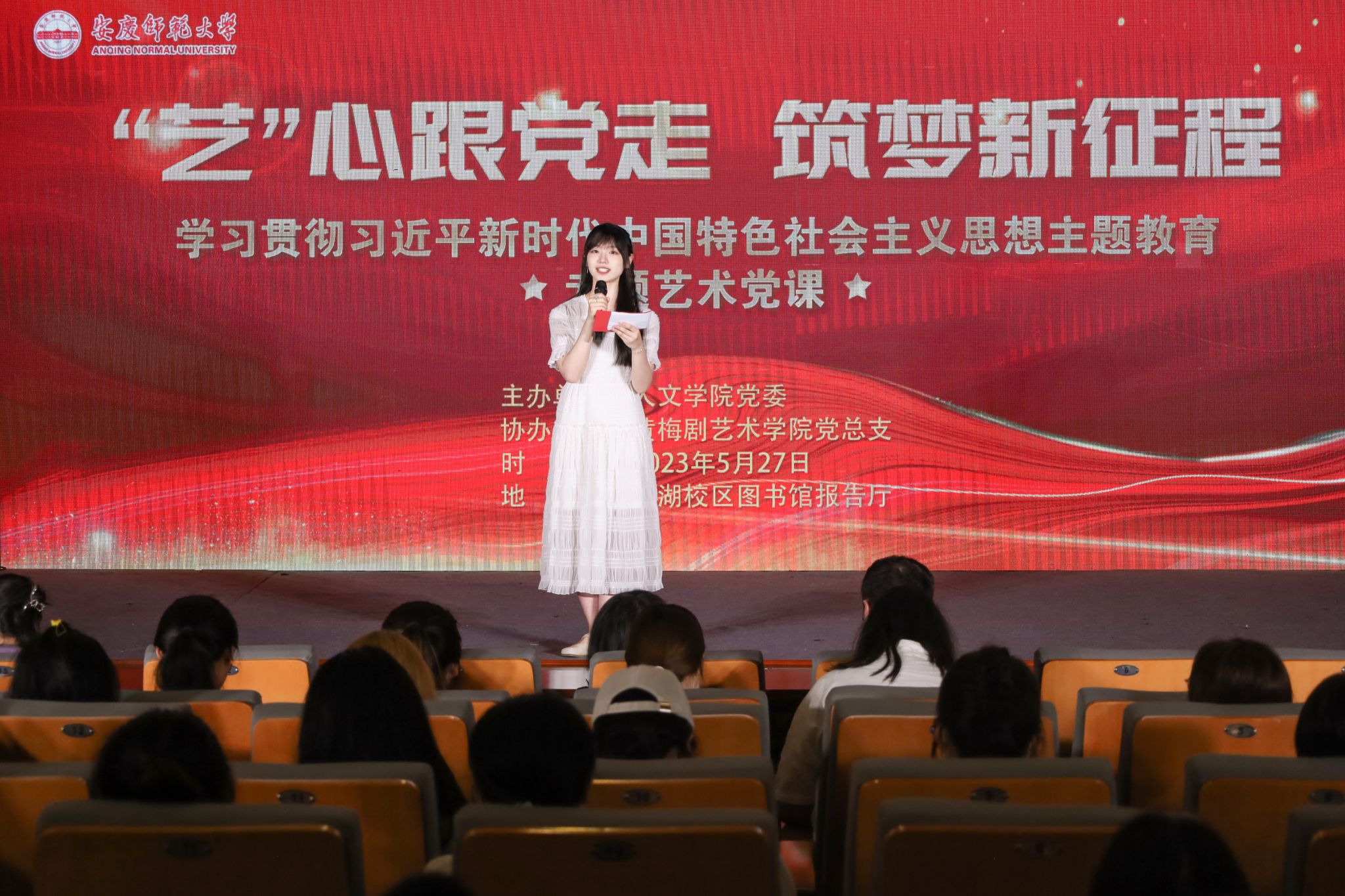 5月27日,一场主题为“艺心跟党走,筑梦新征程”——学习贯彻习近平新时代中国特色社会主义思想主题教育专题艺术党课在菱湖校区图书馆报告厅拉开帷幕。校党委组织部副部长吕佳、伟德国际1949始于英国党委副书记王波、黄梅剧艺术学院副院长刘国平出席活动,两院学生党支部书记等教师代表、第67期入党积极分子、第3期青马班学员近230余人到场观看。